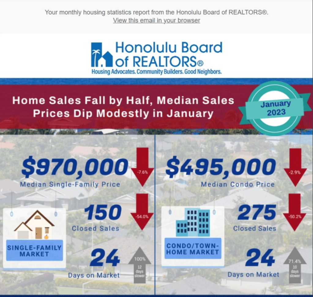上の表は2022年の1月と比較した数字ですが、一軒家もコンドミニアムの販売数は共に50%ダウン、マーケットに出してから買い手が決まるまでに日数も70-100%ダウンになっていますので、これからハワイの不動産の購入をお考えの方は、急がないでゆっくり吟味して物件検索が出来ます。
