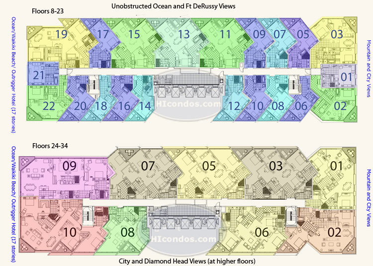 そしてフロアープランお部屋にすべて2桁の番号が記載されていますが、この2桁の数字が偶数の場合、ダイアモンドヘッド側(東)、奇数の場合はサンセット側(西)になり、西側は高層建物が無いので、景色が良く価格も東側よりも高くなっています。
