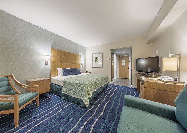 このお部屋コナタワー(低層階ビル)に位置し、クイーンサイズのベットが一つの為、ワイキキタワー(高層階ビル)のお部屋よりも狭いデザイン。オーシャンビューですが、お部屋が狭いので宿泊料が安く設定=宿泊率が高いとの統計が出ています。