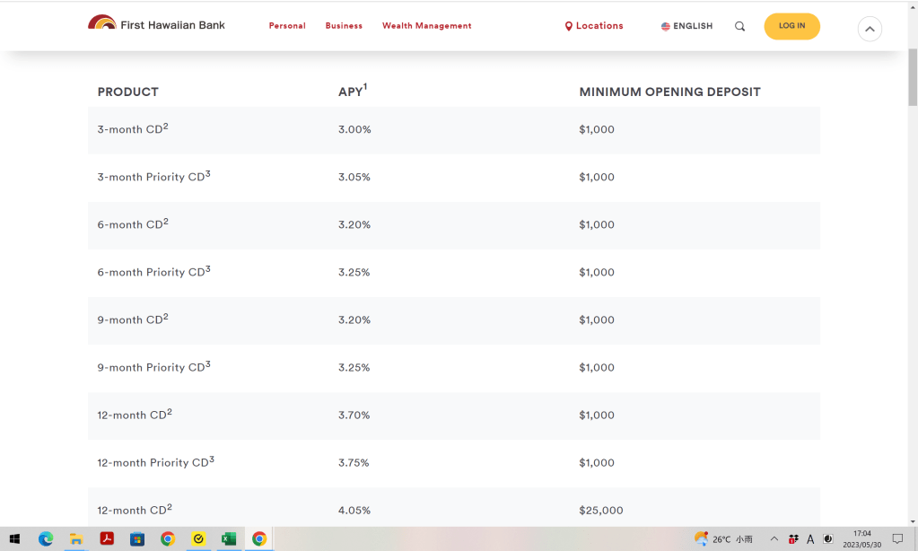 下の画像は今日現在(ハワイ時間5月30日)の定期預金の金利のリストをご紹介します。