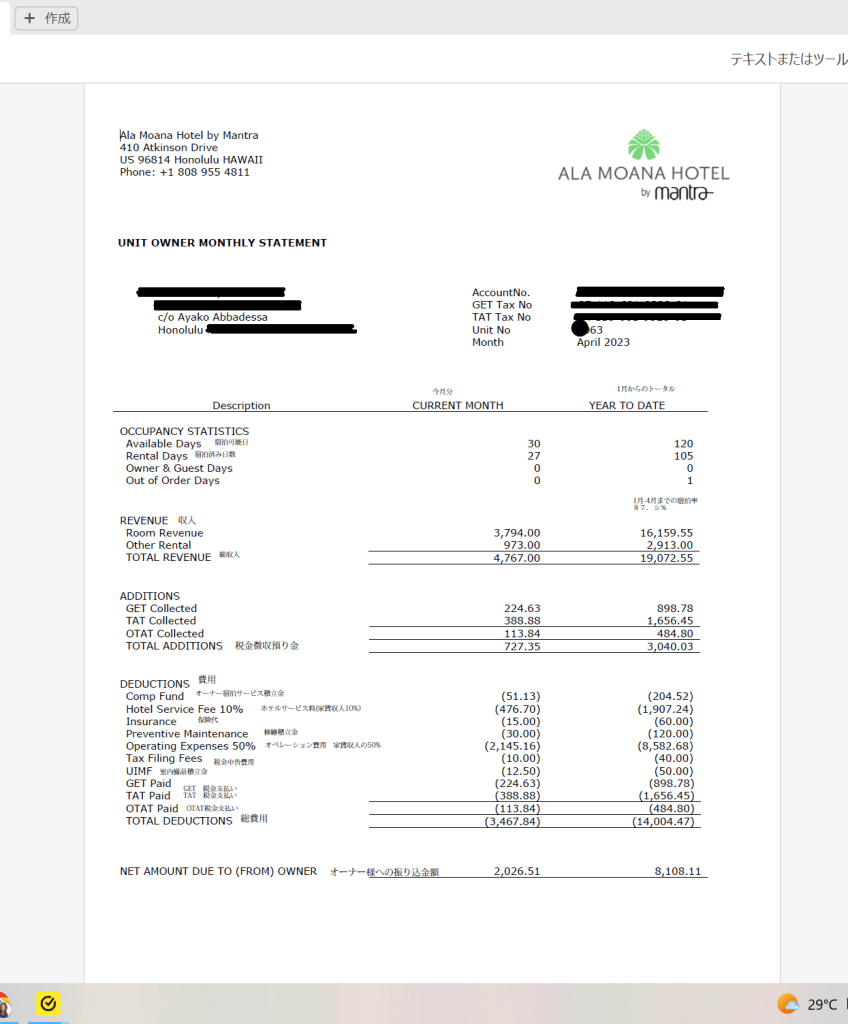 アラモアナホテル スタジオタイプ 2023年4月収支報告書 (日本語訳付き)