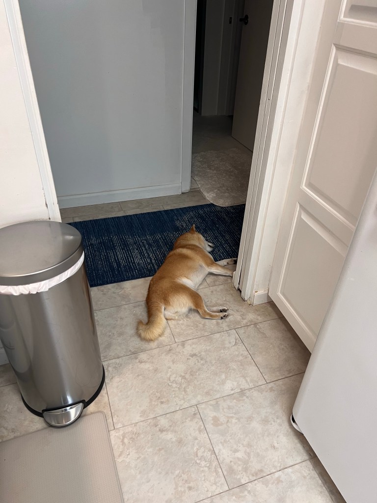 私が料理中はキッチンの入り口で寝転ぶクルミちゃん。