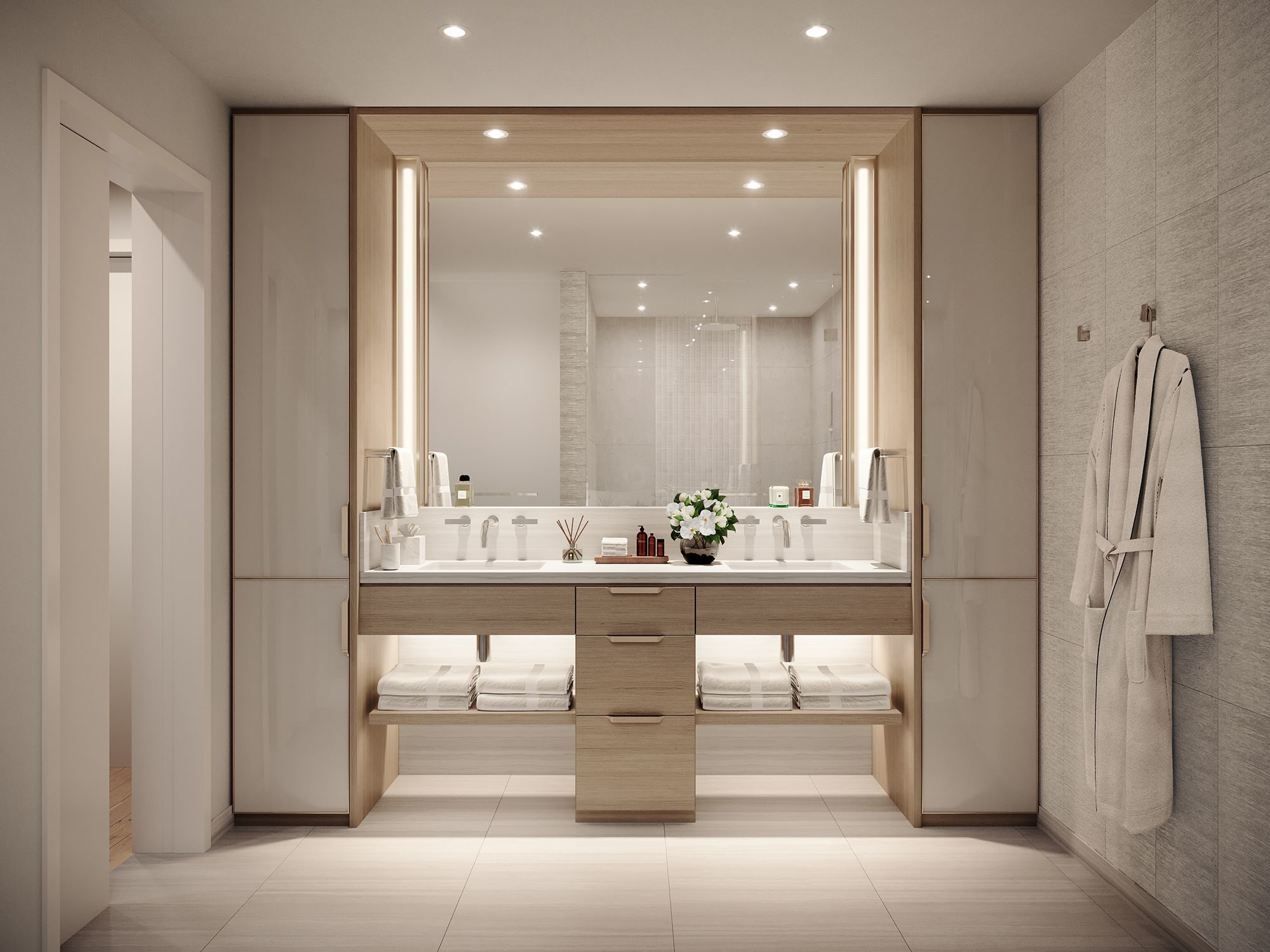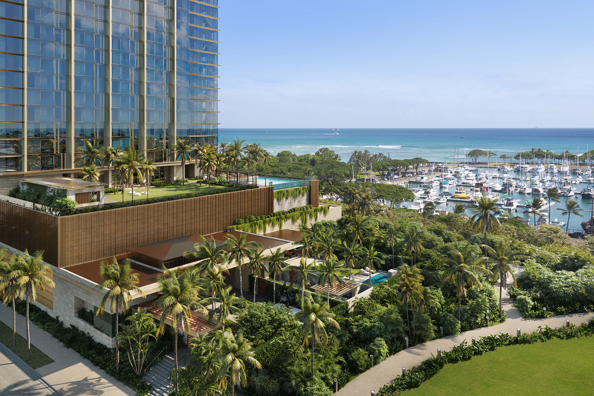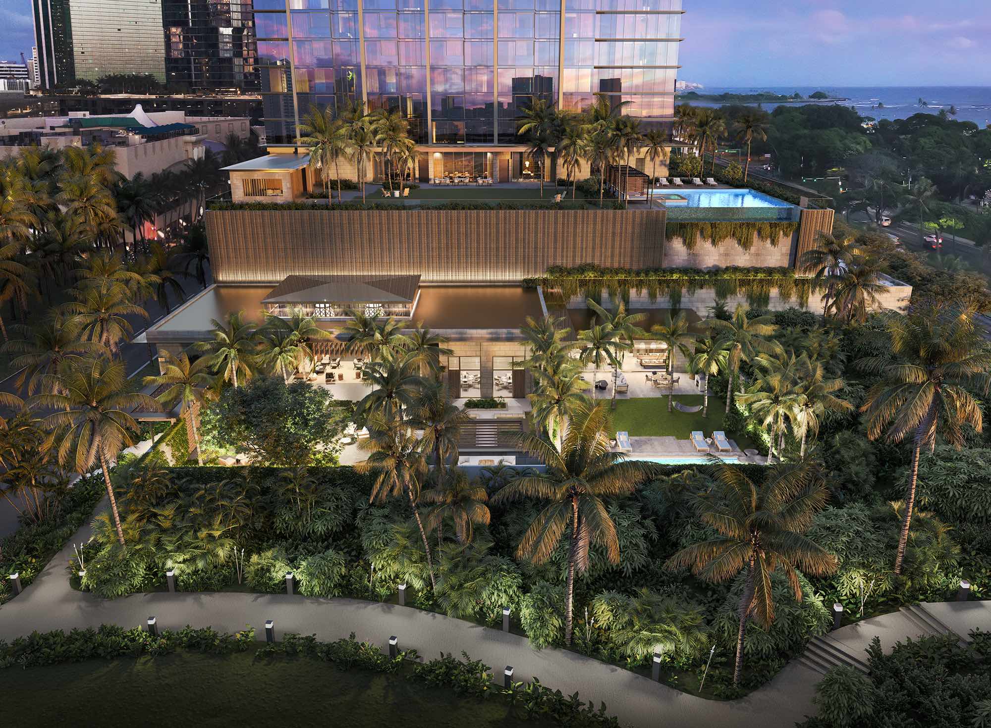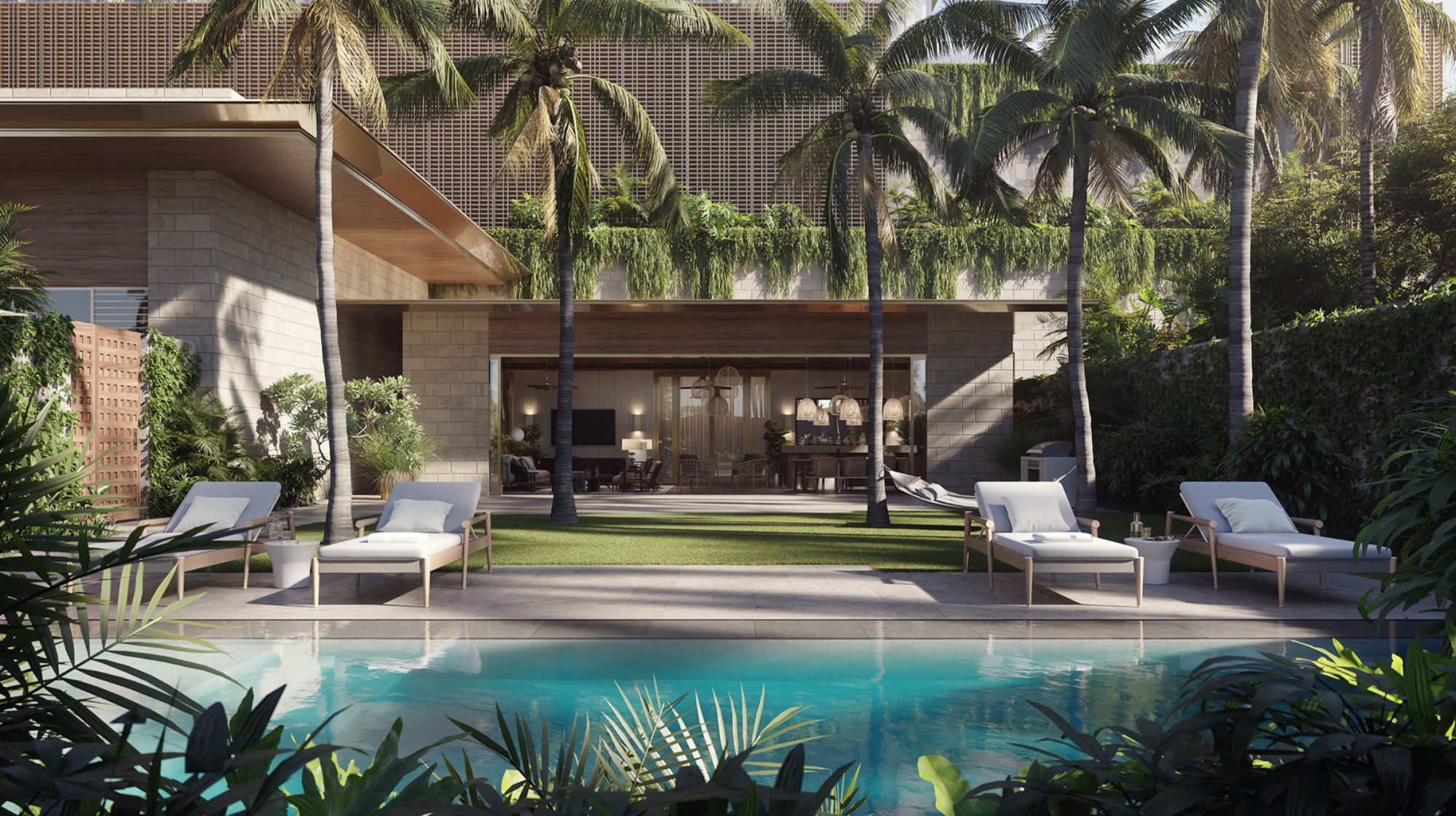 各ユニットは高品質なキッチン家電、木材とガラスを組み合わせたカウンタートップとキャビネットなど、贅沢な設備が整っています。また、プール、BBQカバナ、フィットネスルーム、プライベートダイニングルーム、シアタールーム、スパ、ゲスト宿泊施設、ドッグランなどの豊富なアメニティも完備されています 。